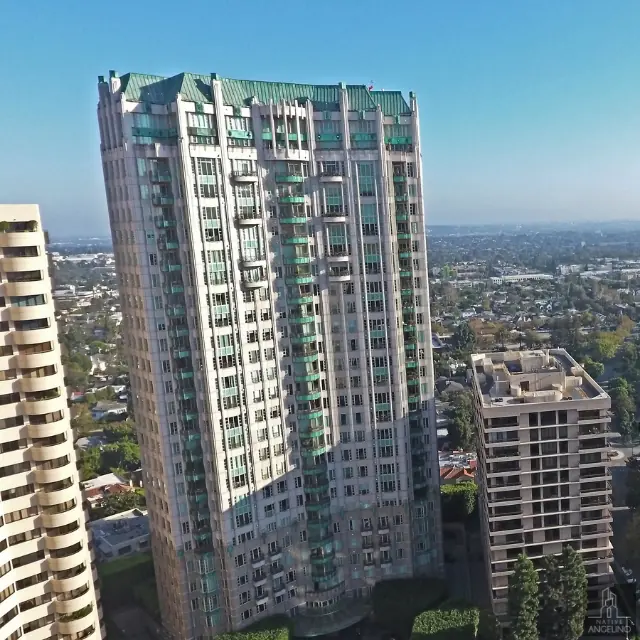 The Wilshire at 10580 Wilshire Boulevard is a 27-story, 328-foot high-rise completed in 1991. Designed by Richard Magee of KMD Architects, it features a structural steel frame, limestone and copper facade, and a distinctive Art Deco-inspired, tiered silhouette.